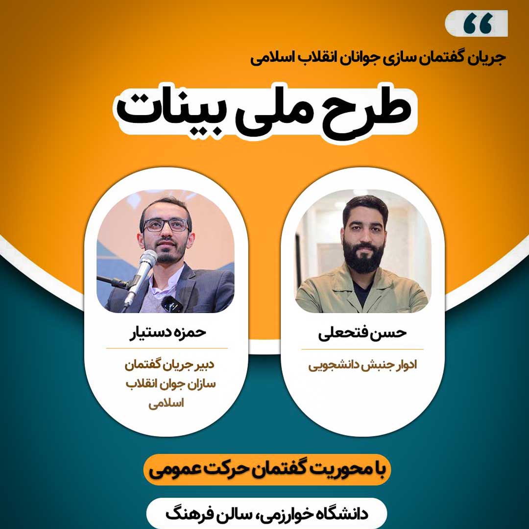 طرح ملی بینات دانشگاهیان مورخ ۱۵ آذر ساعت ۸:۳۰ الی ۱۳ در سالن فرهنگ دانشگاه خوارزمی برگزار خواهد شد.