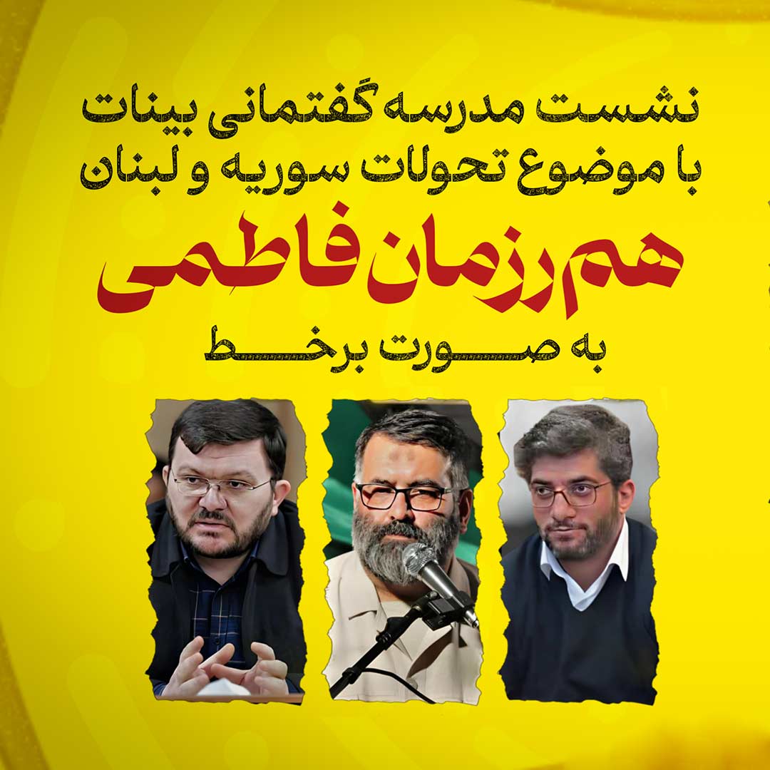 نشست مدرسه گفتمانی بینات بینات با موضوع تحولات سوریه و لبنان مورخ سه شنبه ۱۳ آذر ماه ۱۴۰۳ ساعت ۱۹ به صورت بر خط با حضور حاج عظیم ابراهیم پور(مسئول قرارگاه جهاد تبیین)، سعید سعادتی(معاون جبهه سازی قرارگاه قرب بقیه الله) و ناصر گلدوزها(فعال مردمی جبهه مقاومت )